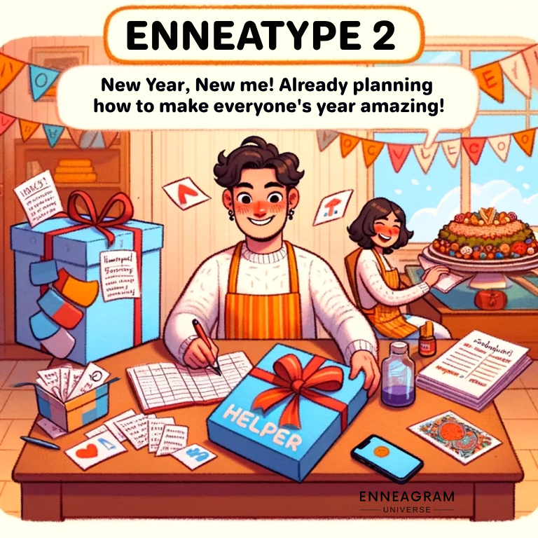 Enquanto os outros pensam em suas resoluções, o Tipo 2 já preparou uma lista personalizada para cada um de seus amigos, oferecendo-se para ajudá-los a cumpri-las. Eles estão tão ocupados em garantir que todos se sintam amados e cuidados que se esquecem de fazer uma lista para si mesmos. Saiba mais sobre o Eneagrama 2 .