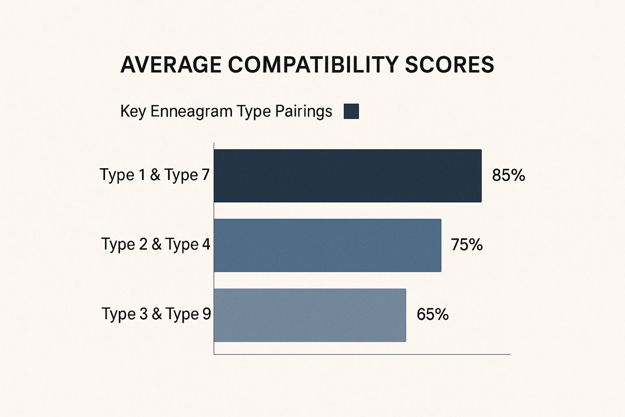 La infografía anterior representa visualmente las puntuaciones medias de compatibilidad de tres emparejamientos clave del Eneagrama: Tipo 1 y Tipo 7, Tipo 2 y Tipo 4, y Tipo 3 y Tipo 9. El dúo Tipo 1 y Tipo 7 presenta una alta compatibilidad media del 85% , lo que sugiere un gran potencial para el éxito de la relación. Aunque otras parejas pueden tener puntuaciones ligeramente inferiores, esto no significa incompatibilidad. Más bien, refuerza el hecho de que todas las relaciones, independientemente del tipo de Eneagrama, requieren esfuerzo y comprensión para prosperar.