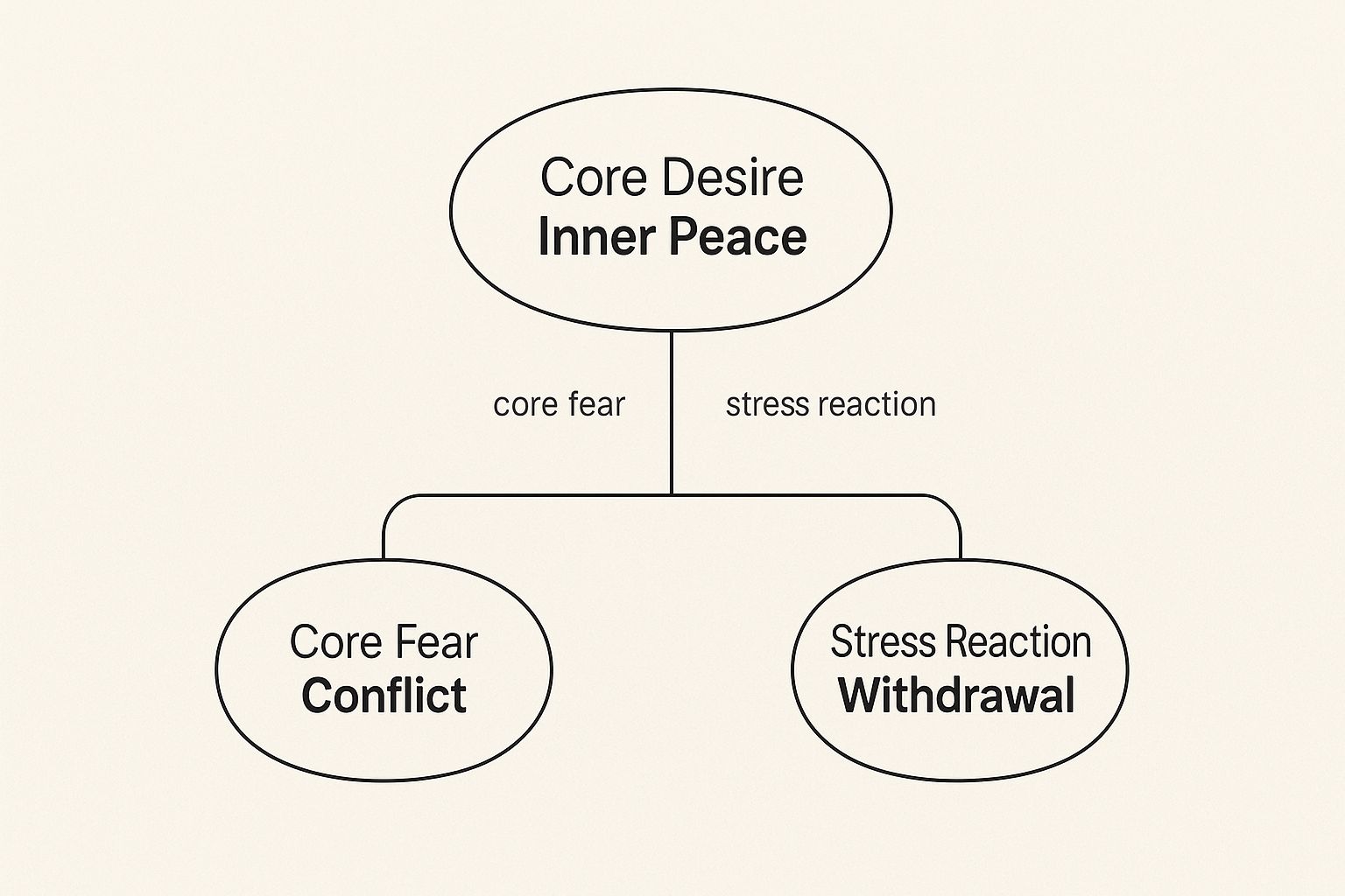 Como ilustra el mapa, su miedo central al conflicto y a la pérdida desencadena directamente el retraimiento. Esta reacción se convierte en la predeterminada, anulando su deseo fundamental de sentir una sensación de paz interior y plenitud.