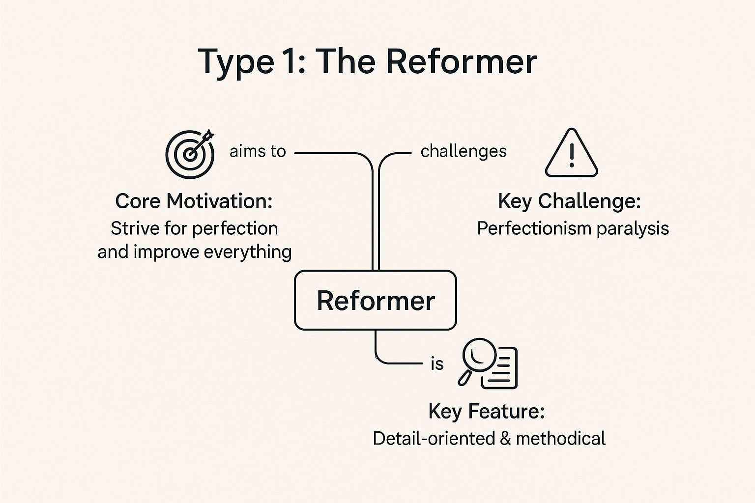 La infografía que aparece a continuación visualiza los conceptos básicos relacionados con la personalidad de Tipo 1, conectando la idea central del "Reformador" con su motivación principal, una característica clave y su principal reto.